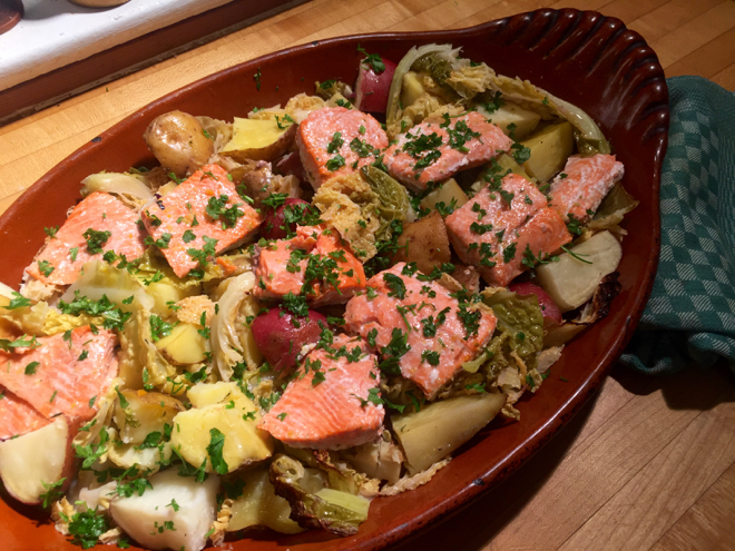 This gorgeous platter of food is less rich than Alice's original--I substitute vegetable broth (my homemade veggie bouillon broth typically) for white wine and chicken stock. I think it is plenty rich and satisfying as is--the butter certainly makes it so. I use salmon whereas she calls for halibut but by all means use what you have--as long it's a fairly substantial, meaty fish. And use regular green cabbage if you don't have savoy--either one is delicious.