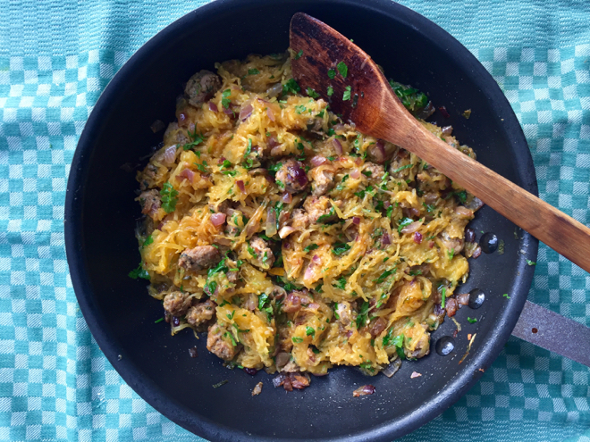 Spaghetti Squash with Bacon/Sausage and Mustard Greens/Herbs