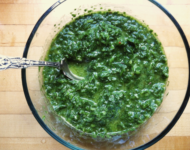 Chimichurri is a bright, vinegary, herb-packed sauce that originated in Argentina and is served with all that grilled beef. It's a really versatile sauce and a close cousin to the Italian Salsa Verde of which I'm equally fond.