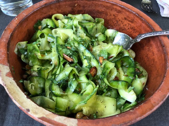 Simple, delicious and beautiful on a hot day, any day, really. You can use other summer squash in place of the zucchini. I began making this dish for my family when I was in high school and it's remained a standby.